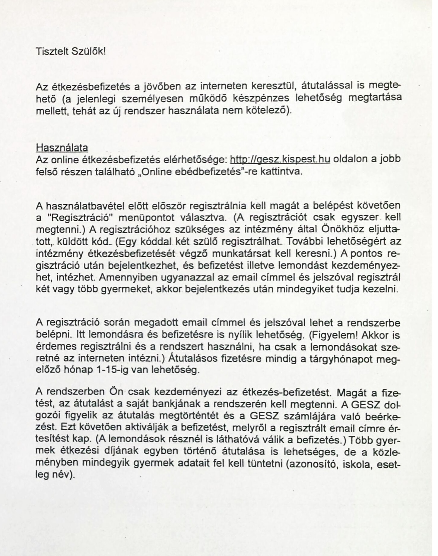 Tisztelt Szülők! A kerületi önkormányzat lehetővé tette, hogy 2017. minden hónap 1-től minden hónap 15-ig a következő havi iskolai étkezési átutalással lehessen befizetni. Ez a lehetőség 2017. március 1-étől elérhető. (2017.03.01-03.15. április hónapra, stb.) Ez nem kötelező, ez csak egy lehetőség. Természetesen, aki azt választja, hogy a régi módszerrel szeretne befizetni, az továbbra is megteheti.