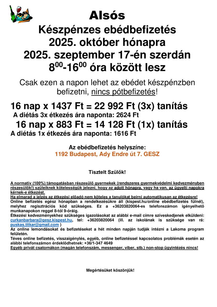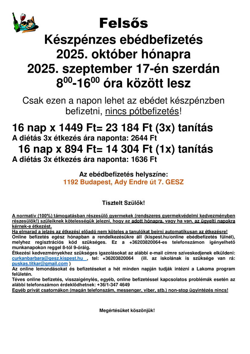 Ebédbefizetés 2025. október Közzétéve 2025-09-10 , Laki Balázs Alsós és felsős ebédbefizetés 2025. október hónapra.